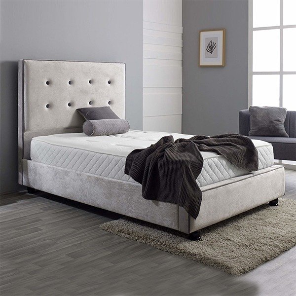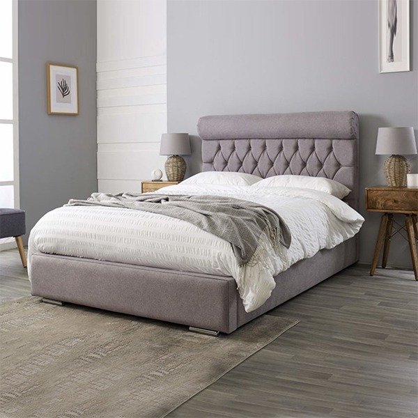 The Monocco Bed is a modern take on the traditional sleigh-style bed. Finished in a soft grey linen and 100% polyester blend, this upholstered bed frame boasts feature scroll and button detailing to the headboard and footend.